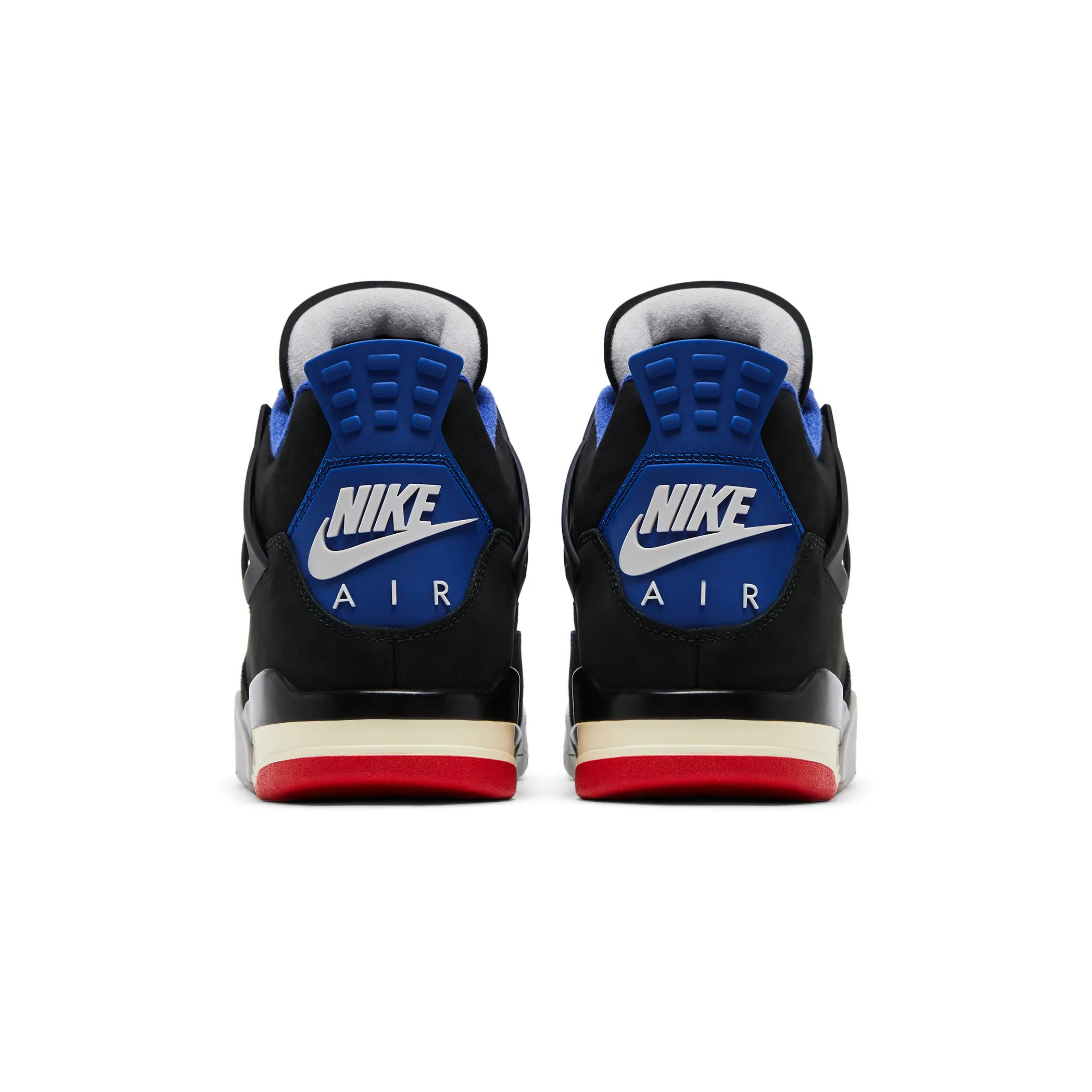 Le Air Jordan 4 Retro "Rare Air - White Lettering" presentano una tomaia in nabuk nero con inserti a rete sui quarti, alette di supporto in TPU e occhielli sagomati in nero e rosso fuoco coordinati. Contornato da cuciture bianche a contrasto, un rivestimento in suede grigio rinforza l'avampiede. Il collare è foderato in tessuto blu royal, abbinato a una linguetta sul tallone con il marchio Nike Air. Patch in velcro intercambiabili decorano la linguetta, mentre il logo "Rare Air" impreziosisce la soletta. A completare la sneaker, un'intersuola in poliuretano con supporto Air, caratterizzata da un accento di colore blu royal e da un tocco di nero intorno al tallone.